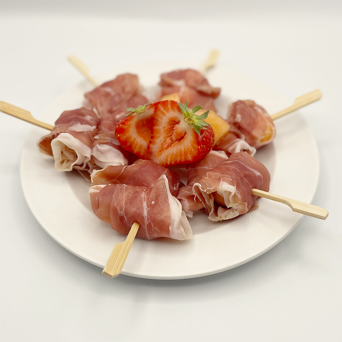 Zwei Kugeln von der süßen Galiamelone mit hauchdünnen Parmaschinken umwickelt und mundgerecht gespießt.
