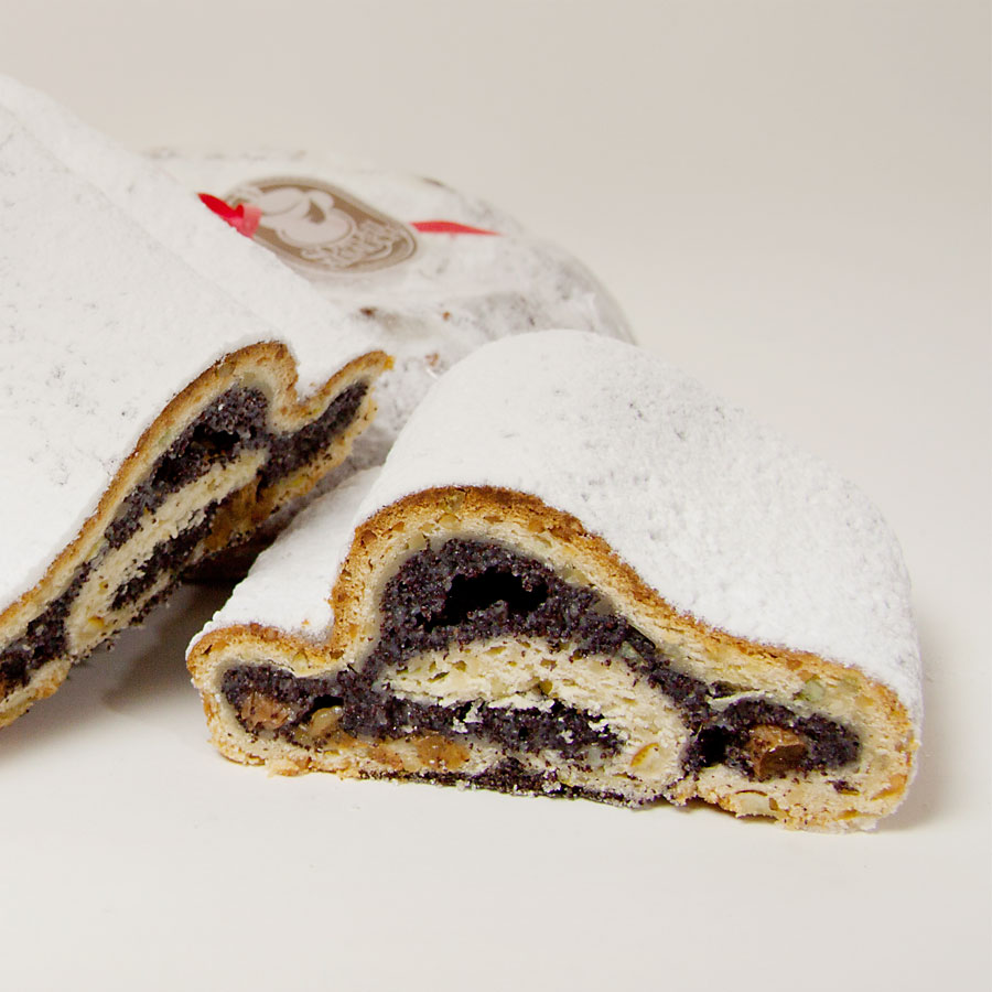 Mohnstollen verkaufen wir im Anschnitt a 500 Gramm (1/2 Stollen)